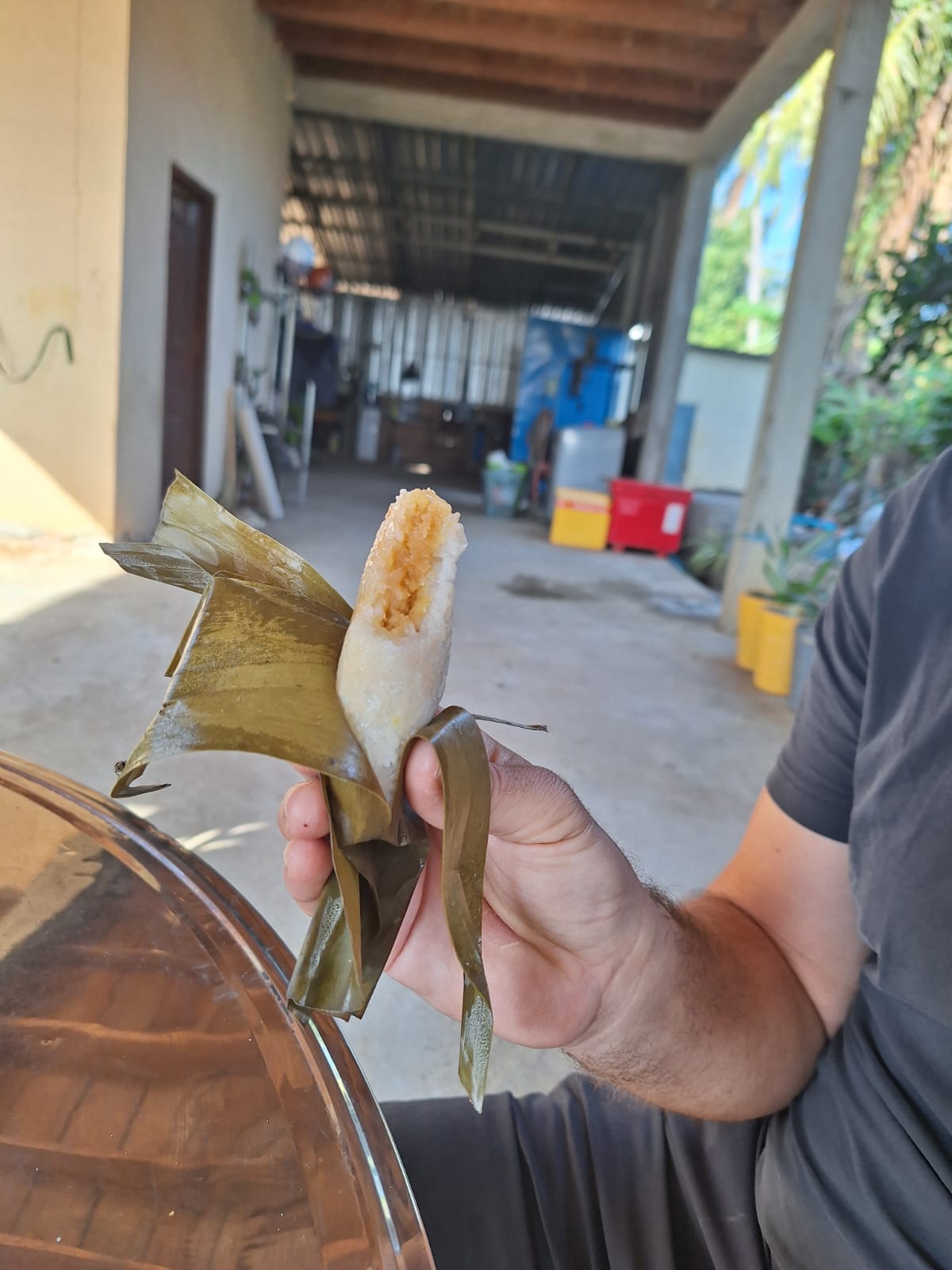 Wir werden hier sehr gut von Shayron, Seareys Frau, verköstigt. Es gibt viele kambodschanische Spezialitäten, wie etwa Klebreis mit Bohnenpaste in Bananenblättern verpackt