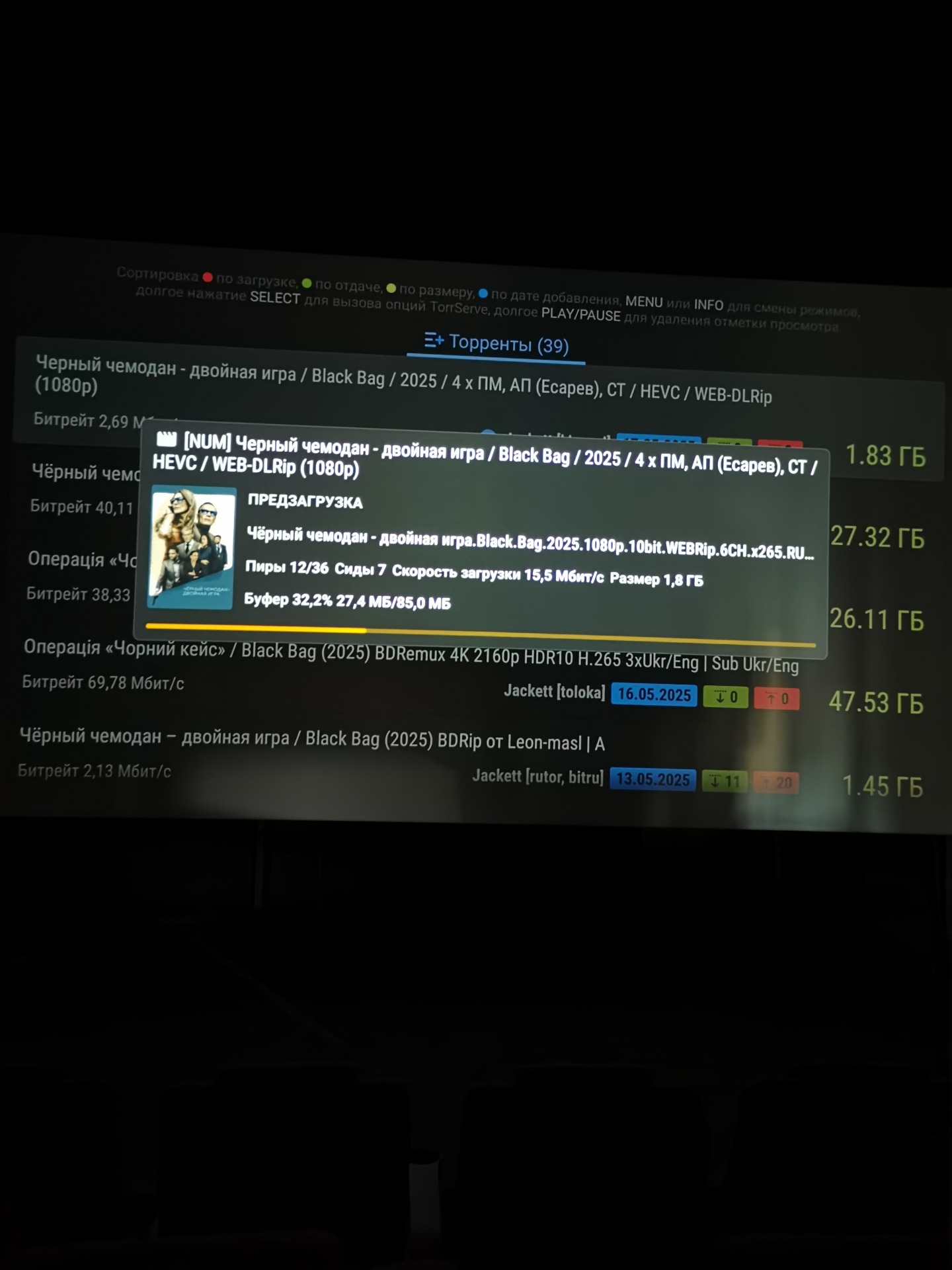 Okay, ich gehe also in Kinosaal 2. Und tatsächlich sieht man auf der Leinwand einige Filmposter, ähnlich wie im Netflix-Auswahlmenü. Keiner der Filme steht auf dem offiziellen Programm... Ich werde gebeten mich zu setzen und mir einen Film auszusuchen. Ich entscheide mich für "Black Bag", einen Agentenfilm mit Michael Fassbender und Cate Blanchett. Der Kinobetreiber lädt den Film schnell runter (siehe Foto), stellt Englisch als Audiospur ein, drückt auf Play und lässt mich mit einem höflichen Nicken im Kinosaal zurück.
